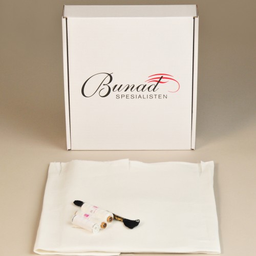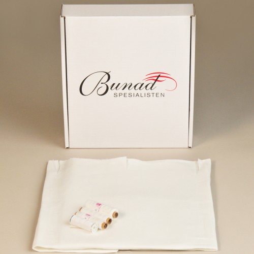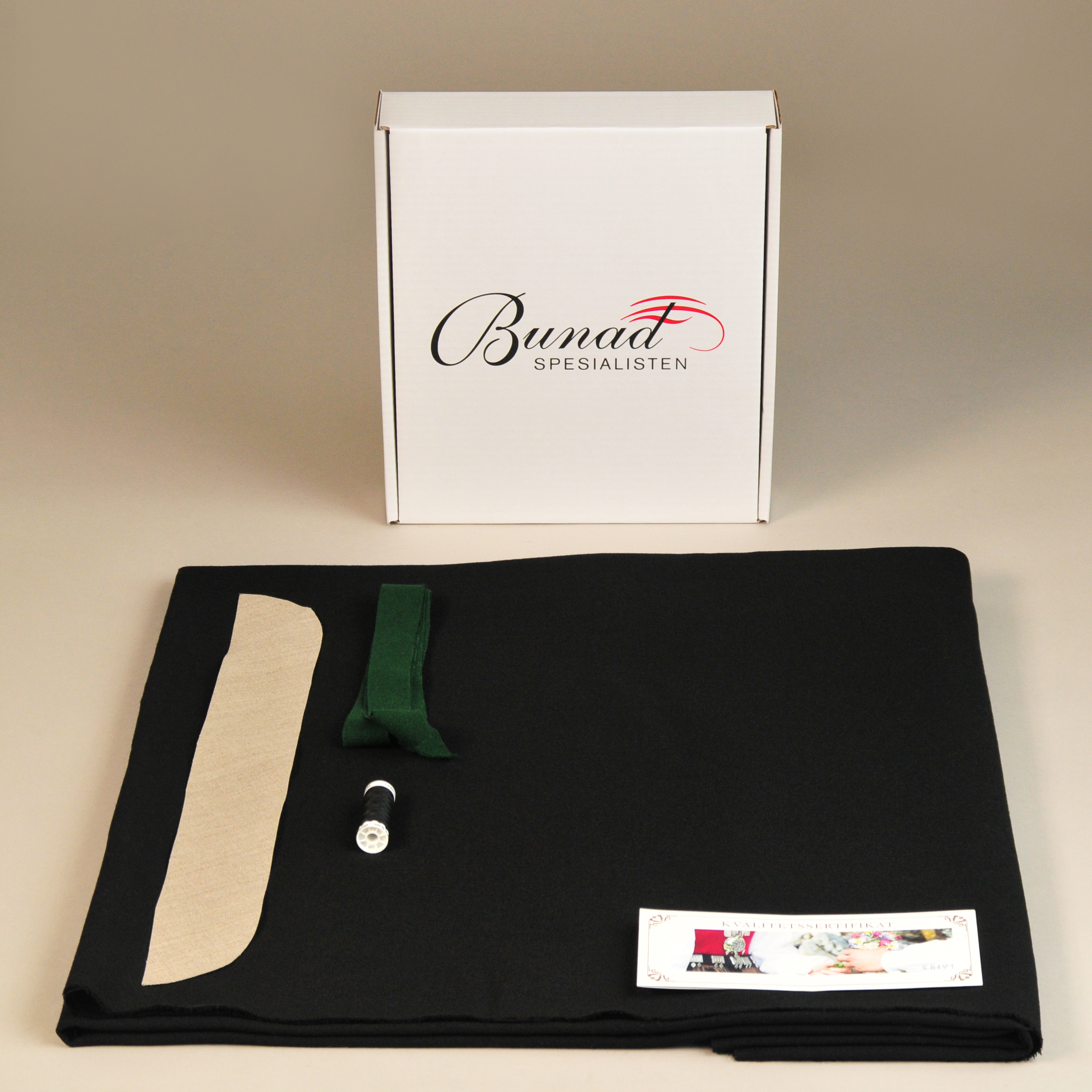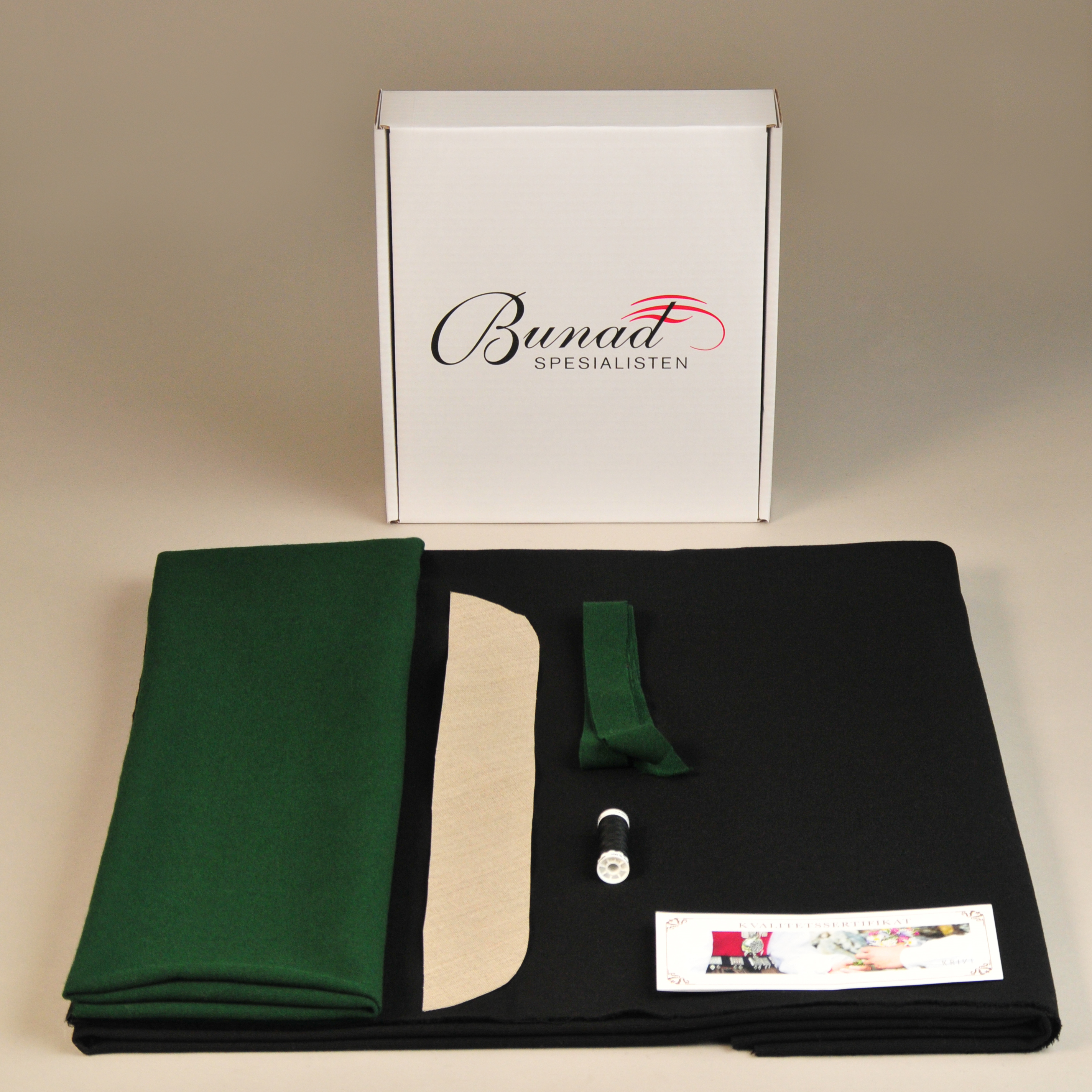 Materialpakken inneholder stoff til vest og stakk, fòrpakke, bånd, nål, tråd, klippemal, monteringsveiledning;